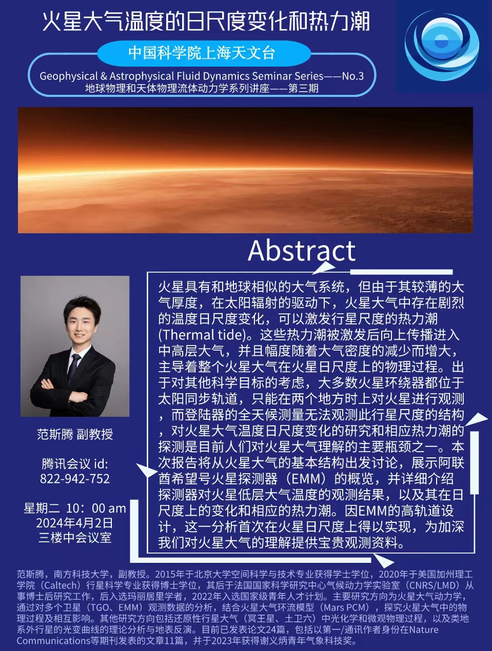 火星具有和地球相似的大气系统,但由于其较薄的大气厚度,在太阳辐射的驱动下,火星大气中存在剧烈的温度日尺度变化,可以激发行星尺度的热力潮(Thermal tide)。这些热力潮被激发后向上传播进入中高层大气,并且幅度随着大气密度的减少而增大,主导着整个火星大气在火星日尺度上的物理过程。出于对其他科学目标的考虑,大多数火星环绕器都位于太阳同步轨道,只能在两个地方时上对火星进行观测,而登陆器的全天候测量无法观测此行星尺度的结构,对火星大气温度日尺度变化的研究和相应热力潮的探测是目前人们对火星大气理解的主要瓶颈之一。本次报告将从火星大气的基本结构出发讨论,展示阿联酋希望号火星探测器(EMM)的概览,并详细介绍探测器对火星低层大气温度的观测结果,以及其在日尺度上的变化和相应的热力潮。因EMM的高轨道设计,这一分析首次在火星日尺度上得以实现,为加深我们对火星大气的理解提供宝贵观测资料。