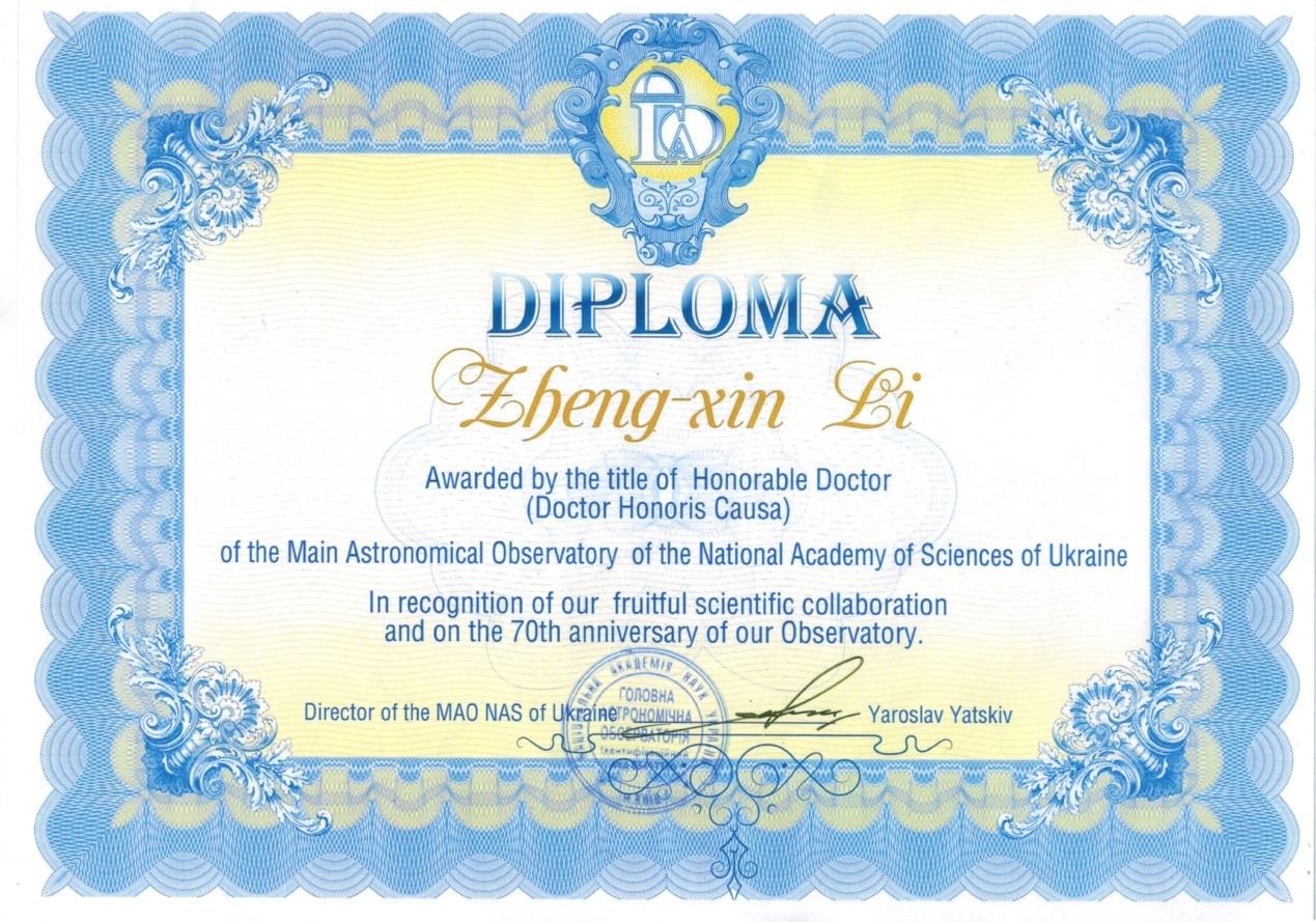 上海天文台天文地球动力学研究中心李正心研究员于2014年7月15日至7月19日应邀参加了乌克兰科学院总天文台建台70周年庆典,并在会议上作了邀请报告,同时被乌克兰科学院总天文台授予荣誉博士学位。